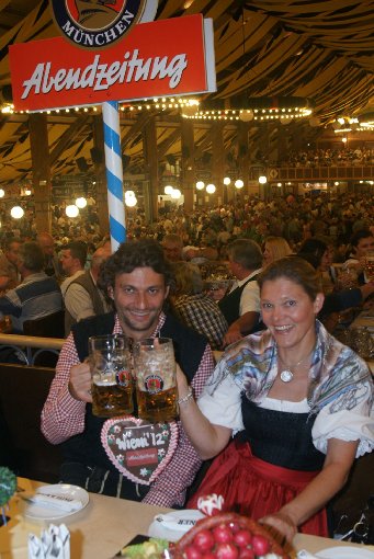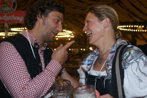 an seiner Maß, als Brigitte Hobmeier hinter ihm steht. „Ich würde so gerne